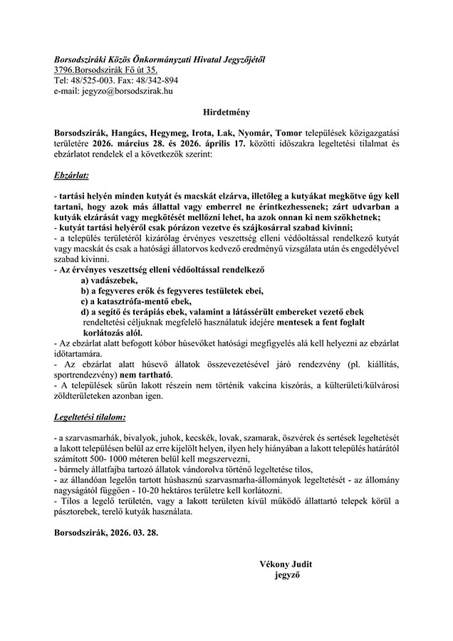 Borsodszirák, Damak, Hangács, Hegymeg, Irota, Lak, Nyomár, Tomor települések közigazgatási területére 2025. március 29. és 2025. április 18. közötti időszakra legeltetési tilalmat és ebzárlatot rendelek el a következők szerint: