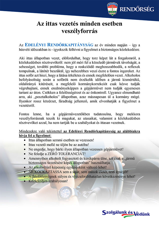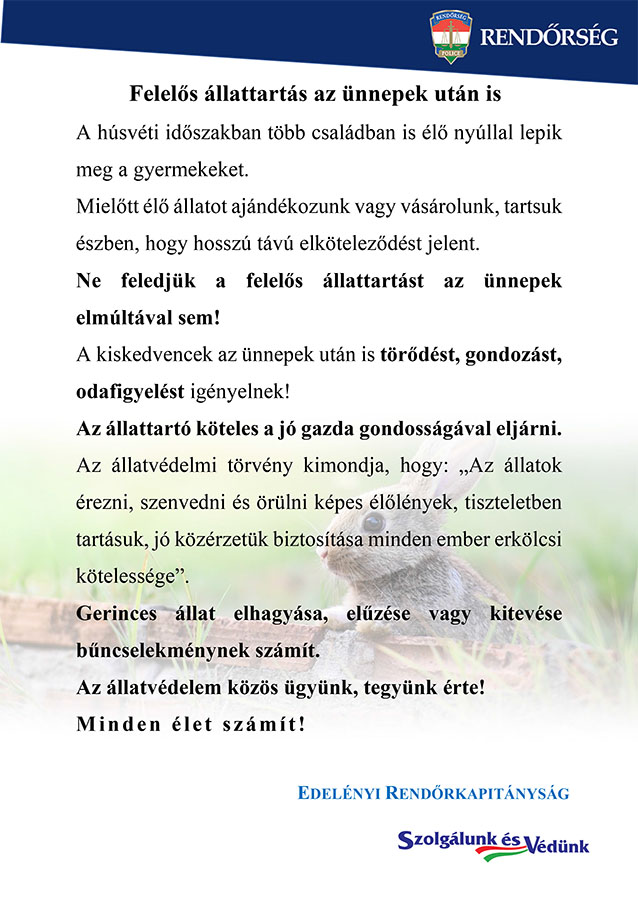Az Edelényi Rendőrkapitányság felhívja a figyelmet az állatok védelmére, valamint a felelős állattartásra, nem csak a világnapon, hanem az év minden napján.
